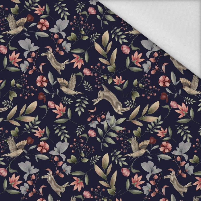 HARES AND BIRDS (INTO THE WOODS) DARK BLUE - Waterproof woven fabric