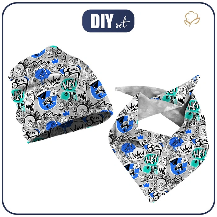 KID'S CAP AND SCARF (CLASSIC) - GRAFFITI / blue (SCHOOL DRAWINGS) - sewing set