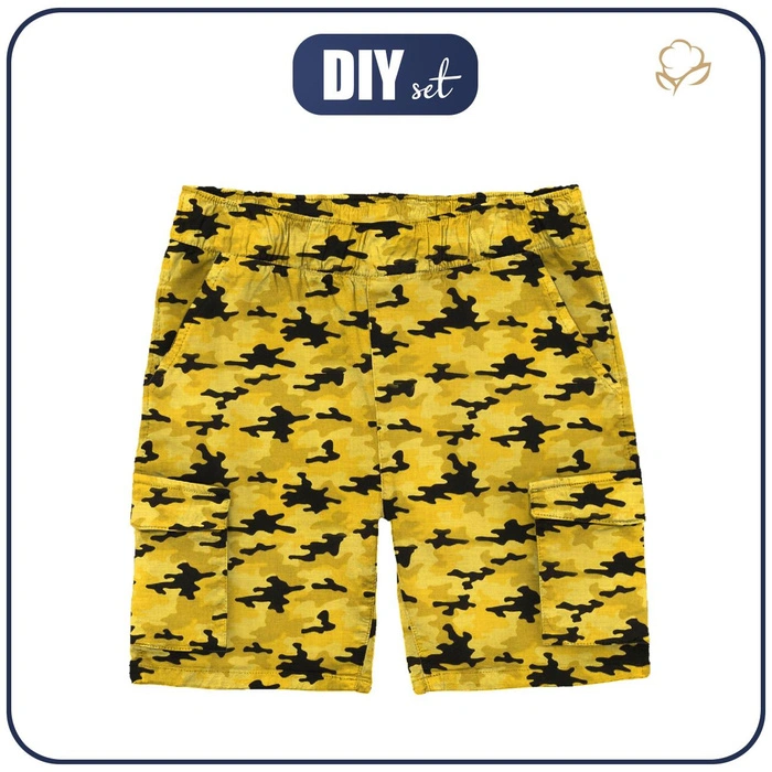 The set includes the material needed to sew kid's cargo shorts together with a paper cut-out.
