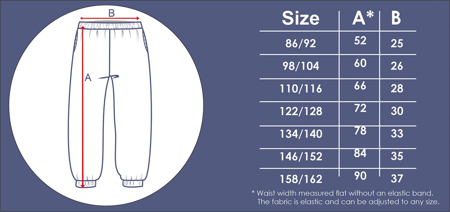 The kid’s joggers ROBIN set contains a pattern printed directly on the fabric. This eliminates the problem of transferring the pattern from paper to fabric. Sizes are according to the size chart below.