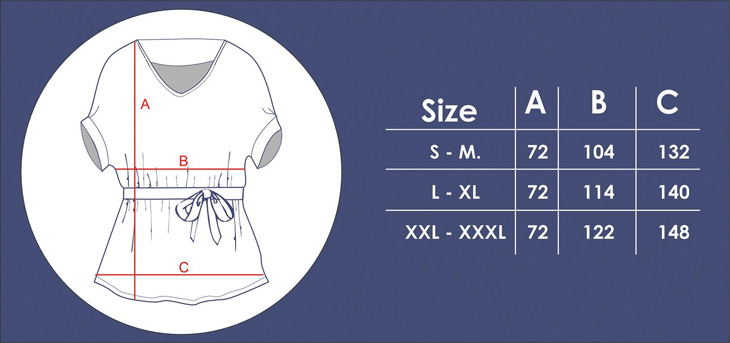 many women who appreciate comfortable fashion. Our kimono is comfortable to wear, without restricting movement or unnecessary creases. The sleeves are finished with a counter-fold and cuff, which makes the kimono look unusual and elegant. The model has a V neckline, optically slimming and elongating the neck. An additional tie belt allows you to individually adjust the blouse to your figure. You can wear it loose-fitting, or tie the belt to accentuate your waist and add some elegance to your styling.