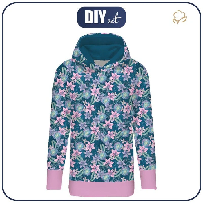 LONG WOMEN’S HOODIE - WATER WORLD pat. 1 / sea blue - looped knit fabric - S