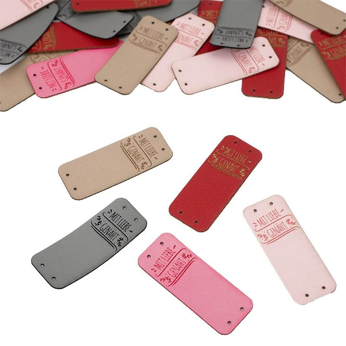 One-sided leatherette tag with rounded edges decorated with the inscription "MIT LIEBE GENÄHT"