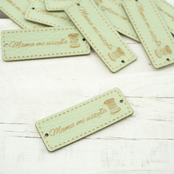 Decorative Cloting Label with sign "Mama mi uszyła". The label is made of eco leather and has holes on sides for easy attachement.