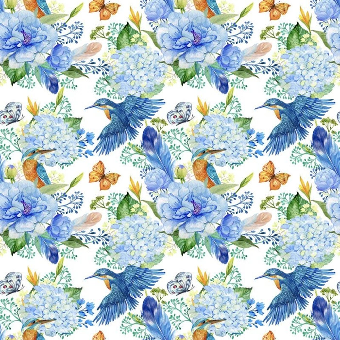 MINI KINGFISHERS AND LILACS (KINGFISHERS IN THE MEADOW) / white - Linen 100%