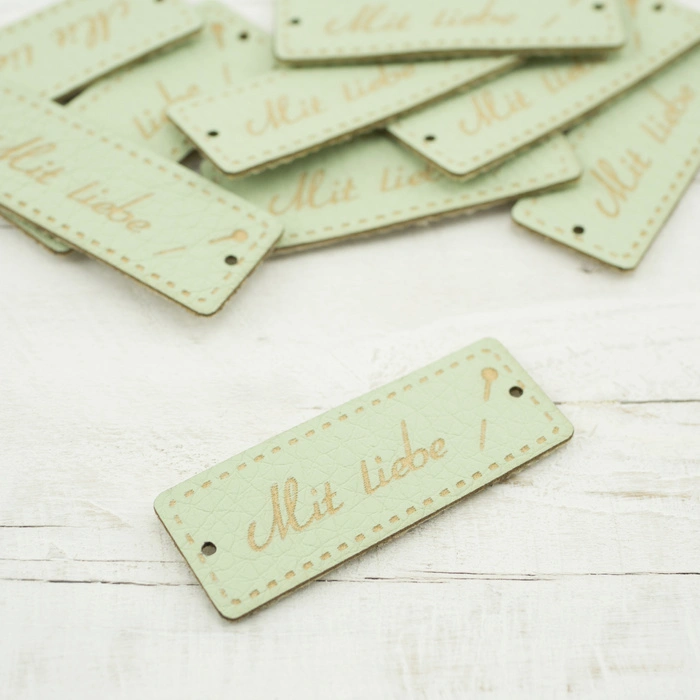 Decorative Cloting Label with sign "Mit liebe". The label is made of eco leather and has holes on sides for easy attachement.