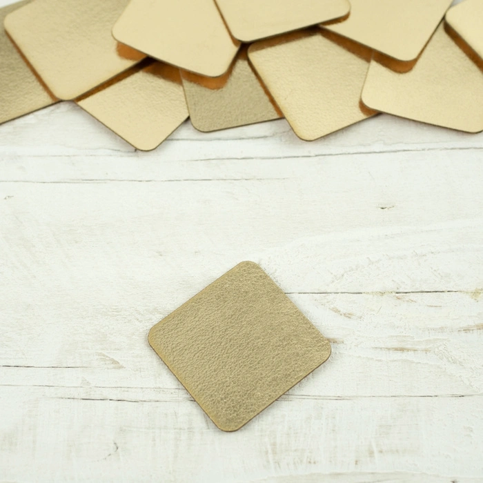 Decorative Label is made of wrinkled eco leather shaped as a big square. The rims of the labels are rounded.