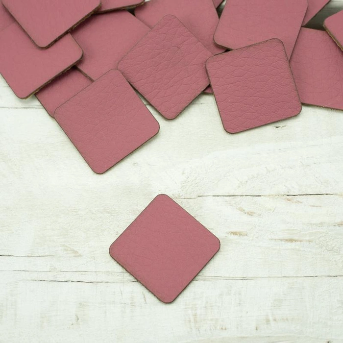 Decorative Label is made of wrinkled eco leather shaped as a small square. The rims of the labels are rounded.