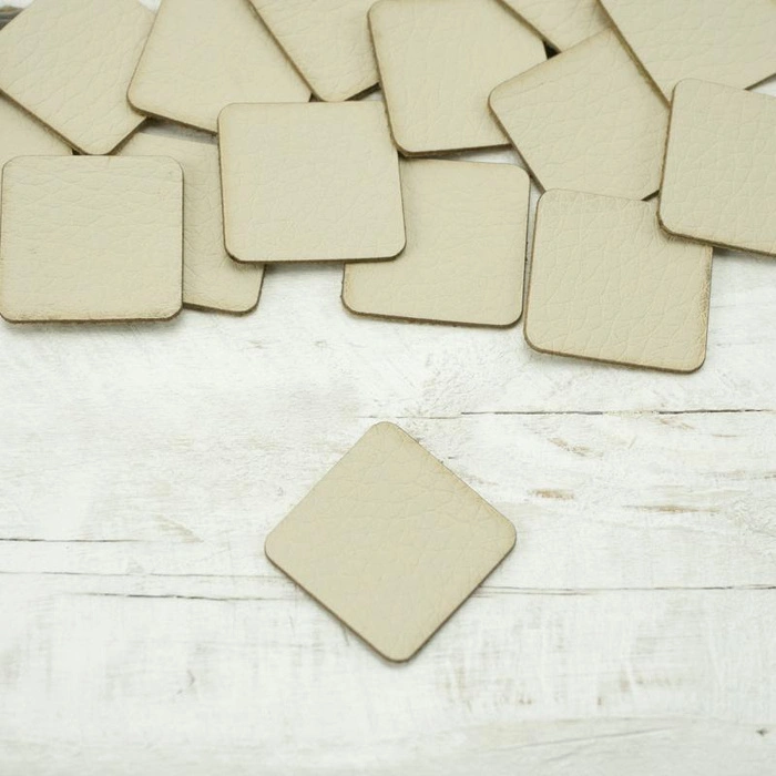 Decorative Label is made of wrinkled eco leather shaped as a small square. The rims of the labels are rounded.