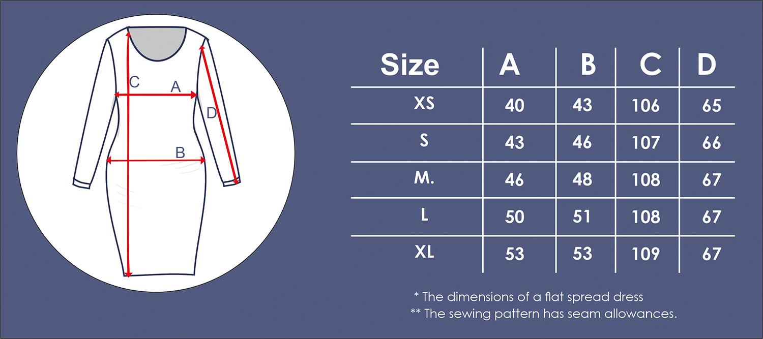The sizes are according to the dimension table we provided below. The "Pencil dress ALISA " set includes a seam allowance.
