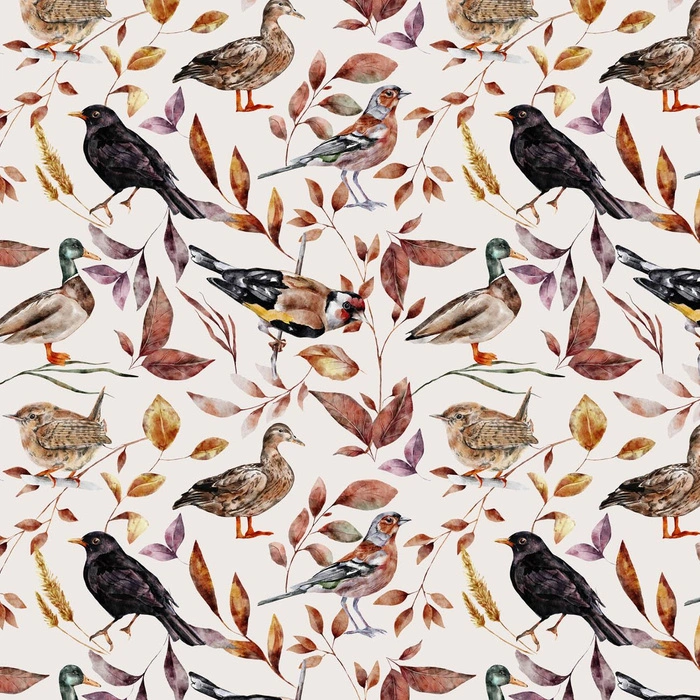BIRDS PAT. 2 / WHITE (COLORFUL AUTUMN) - Cotton woven fabric