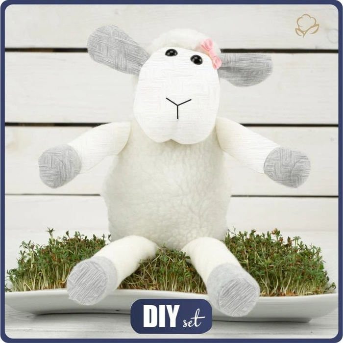In the set you will find all necessary products for sewing a sheep mascot. All parts are packed in a cardboard box.