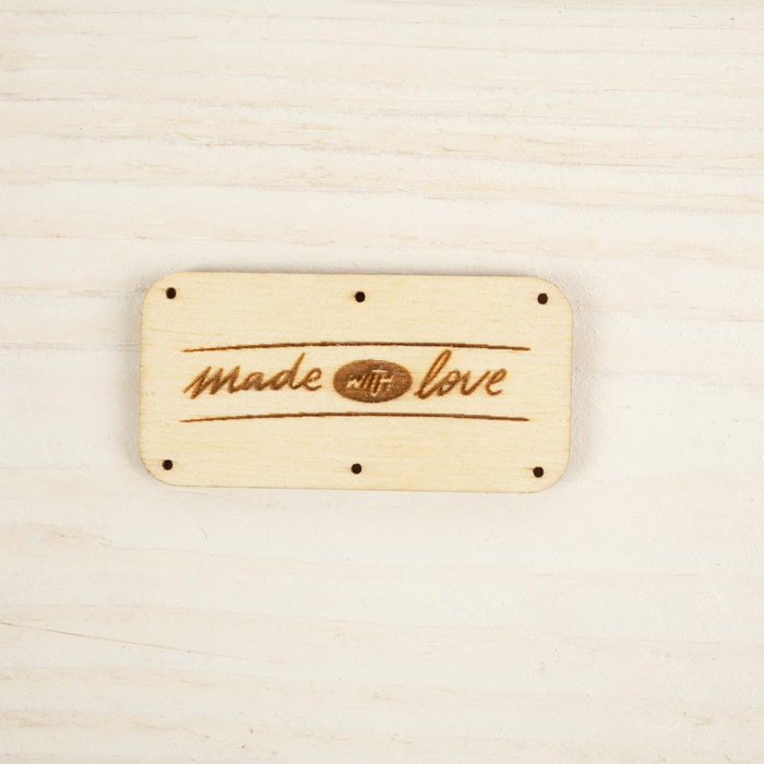 A wooden label in the shape of a rectangle decorated with the one-sided inscription "MADE WITH LOVE". Equipped with small holes, perfect for sewing. We do not recommend washing them.