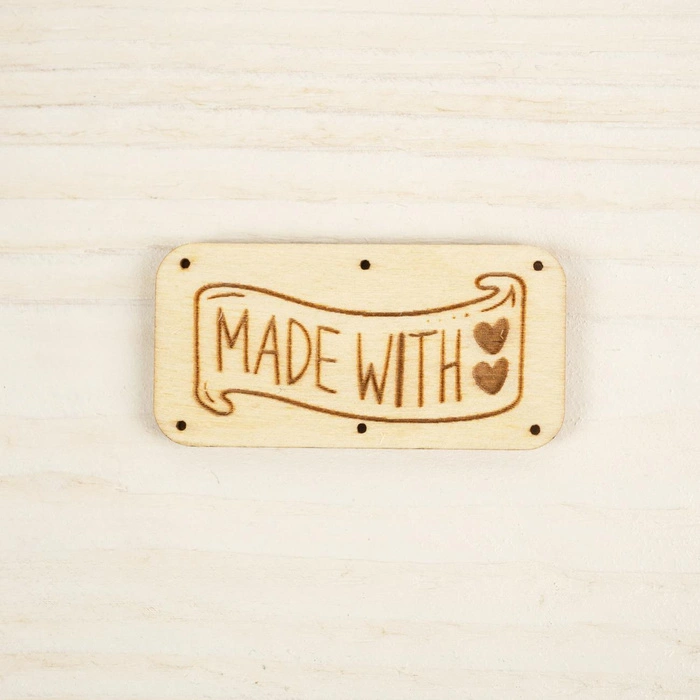 A wooden label in the shape of a rectangle decorated with the one-sided inscription "MADE WITH LOVE". Equipped with small holes, perfect for sewing. We do not recommend washing them.